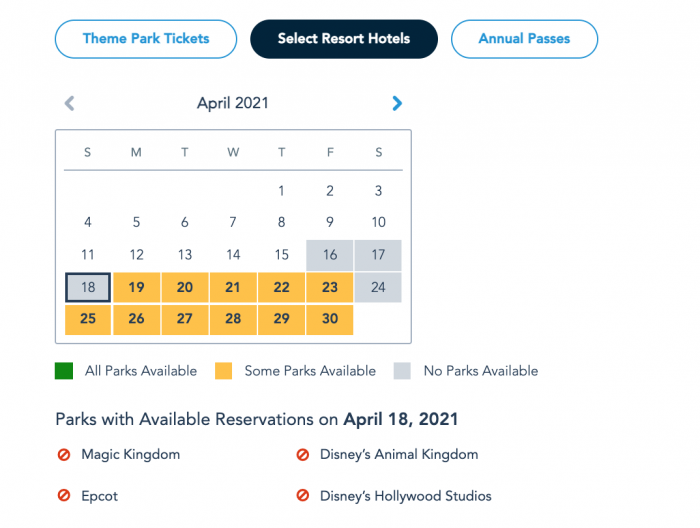 Current Park Pass Reservation availability for guests staying at Select Resort Hotels on April 18th as of April 16th © Disney