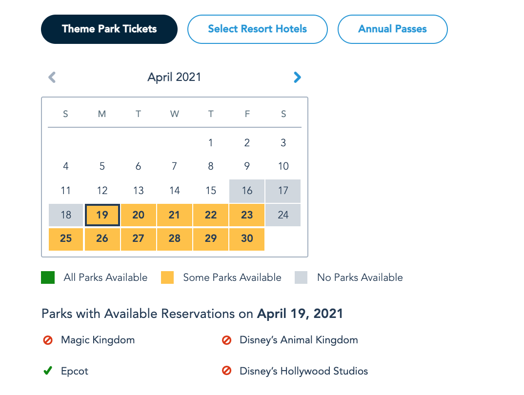 Theme Park Ticket guests (those not staying at the Select Resort Hotels) have near-identical availability for next week with one exception. On Sunday, April 18th and Saturday, April 24th, guests with Theme Park Tickets cannot book a Park Pass Reservation as all four theme parks are full.