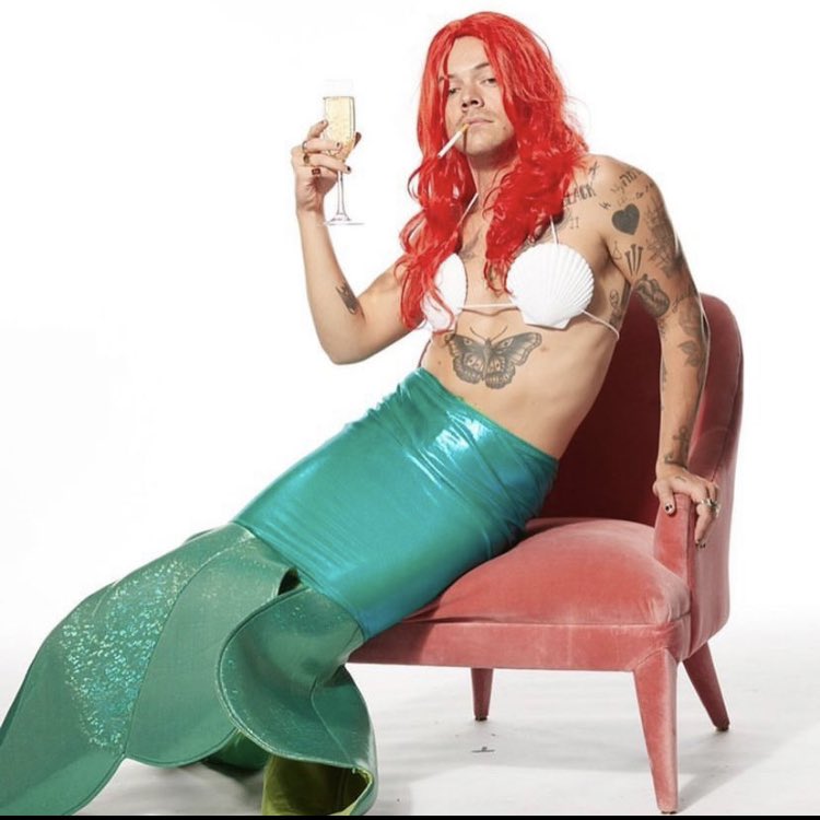 In the photos, Styles is dressed in Ariel’s iconic red wig and green mermaid tail complete with a seashell top. He’s also holding a glass of champagne — life IS the bubbles under the sea!Â
