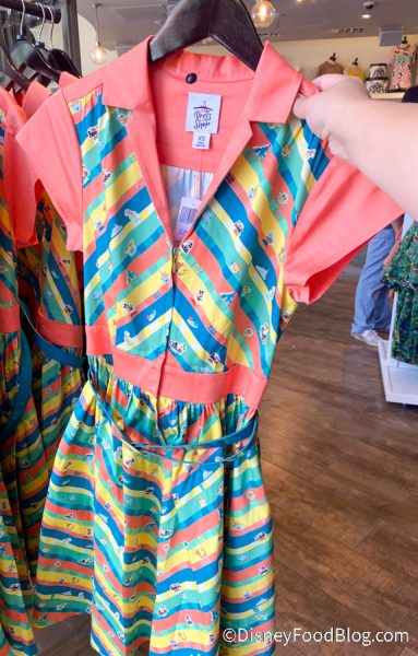 Well, it IS called “The Dress Shop,” and we found that beautiful and colorful vintage-like dress we previously spotted at Disney World! Will you look at this gorgeous thing? It’s $128. It’s got a fun pattern of all kinds of Disney icons on it.
