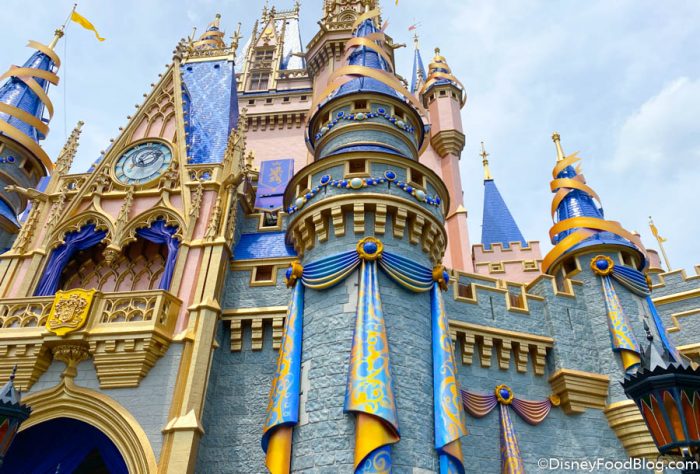 Cinderella Castle continues to get glammed up for the celebration of the 50th Anniversary of Disney World. We noticed a few more ribbon details added to the spires.