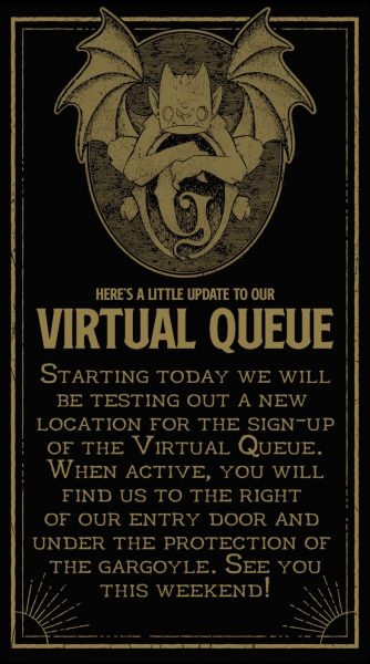 Previously, guests would join the Gideon’s virtual queue to the left of the building. Now, that location has MOVED. You’ll find the Gideon’s employee with the tablet ready to sign ya up to the right of the building, right underneath Gideon’s Gargoyle!