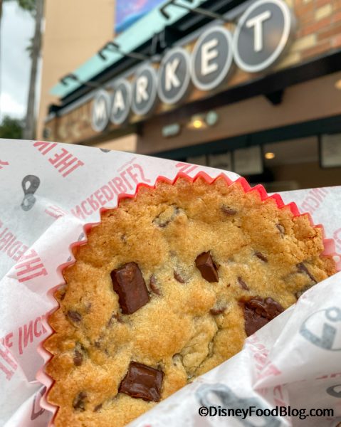 We saved the best for last! It’s time to head on over to Disney Springs to Gideon’s Bakehouse. And although, there are SO many interesting flavors there, we’re going with the classic Original Chocolate Chip Cookie. This isn’t just an ordinary chocolate chip cookie, though, it’s got LOADS of chocolate chips, like BOATLOADS of chips.