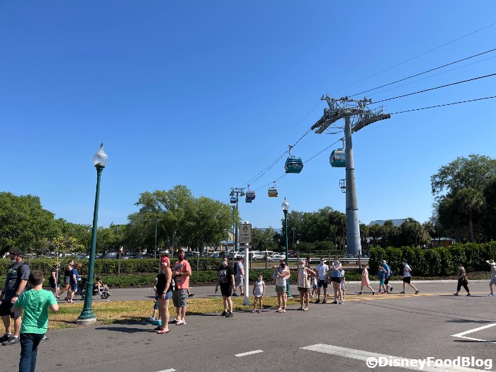 Due to limited capacity and social distancing requirements on the different forms of Disney transportation, the lines to get on these forms of transportation can back up quite a bit. That’s particularly true for Disney World’s newest form of transportation — the Skyliner.