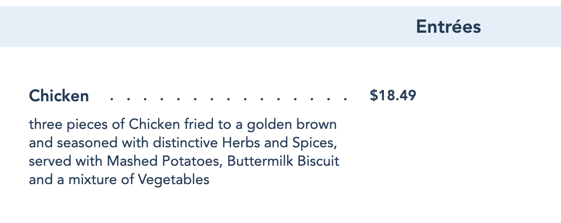 Currently, there’s only ONE thing on the entree menu — chicken. You’ll get three pieces of the Plaza Inn’s famous fried chicken with mashed potatoes, a buttermilk biscuit, and vegetables. Talk about a limited offering!