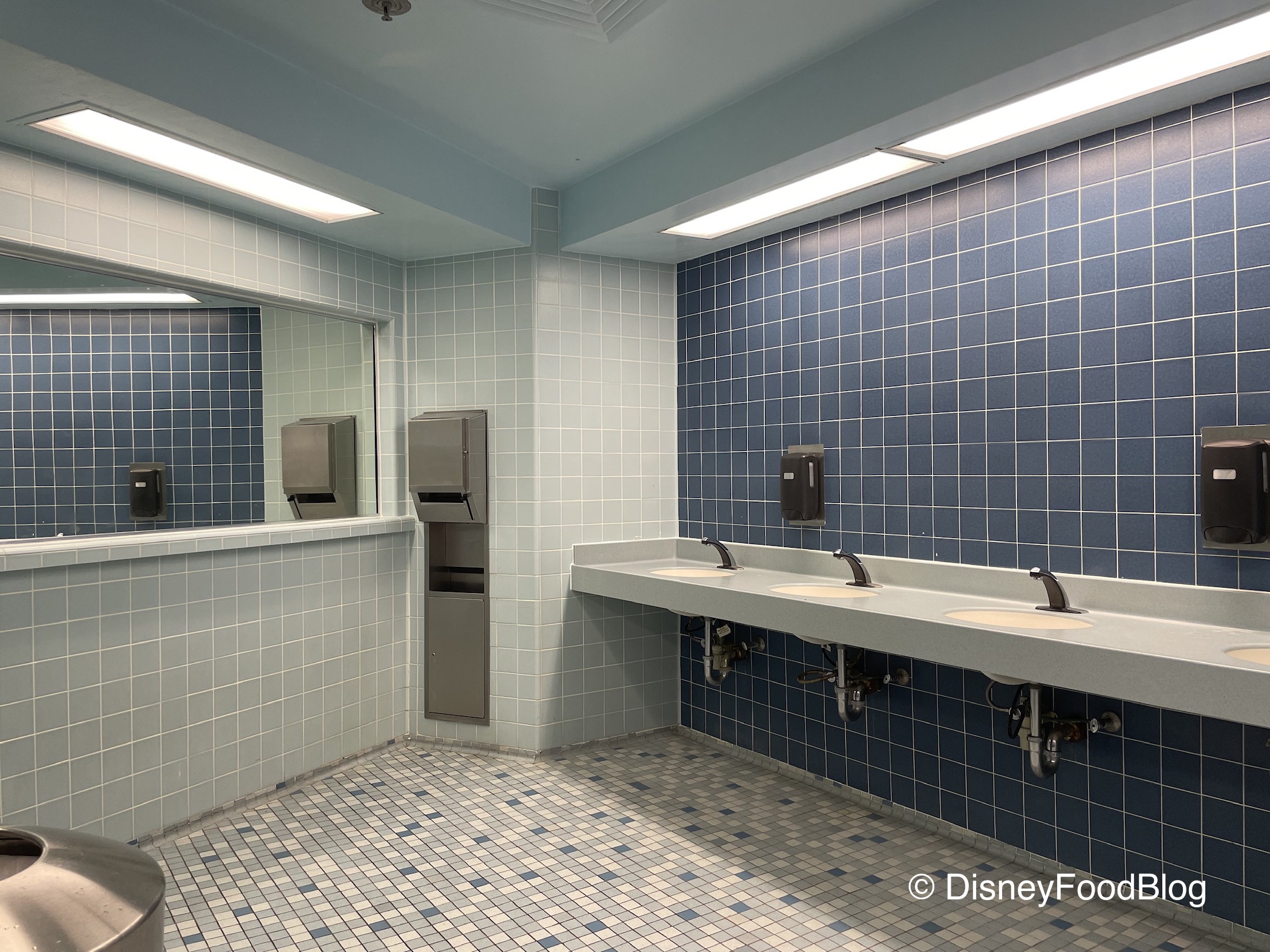 The outdoor bathroom is usually the more crowded one, probably because people can see it as they walk by. The indoor bathroom, however, is never very busy and is newly remodeled! It tends to feel really clean, especially for a Disney bathroom. There’s also a place where you can refill your water bottles over in this same area.