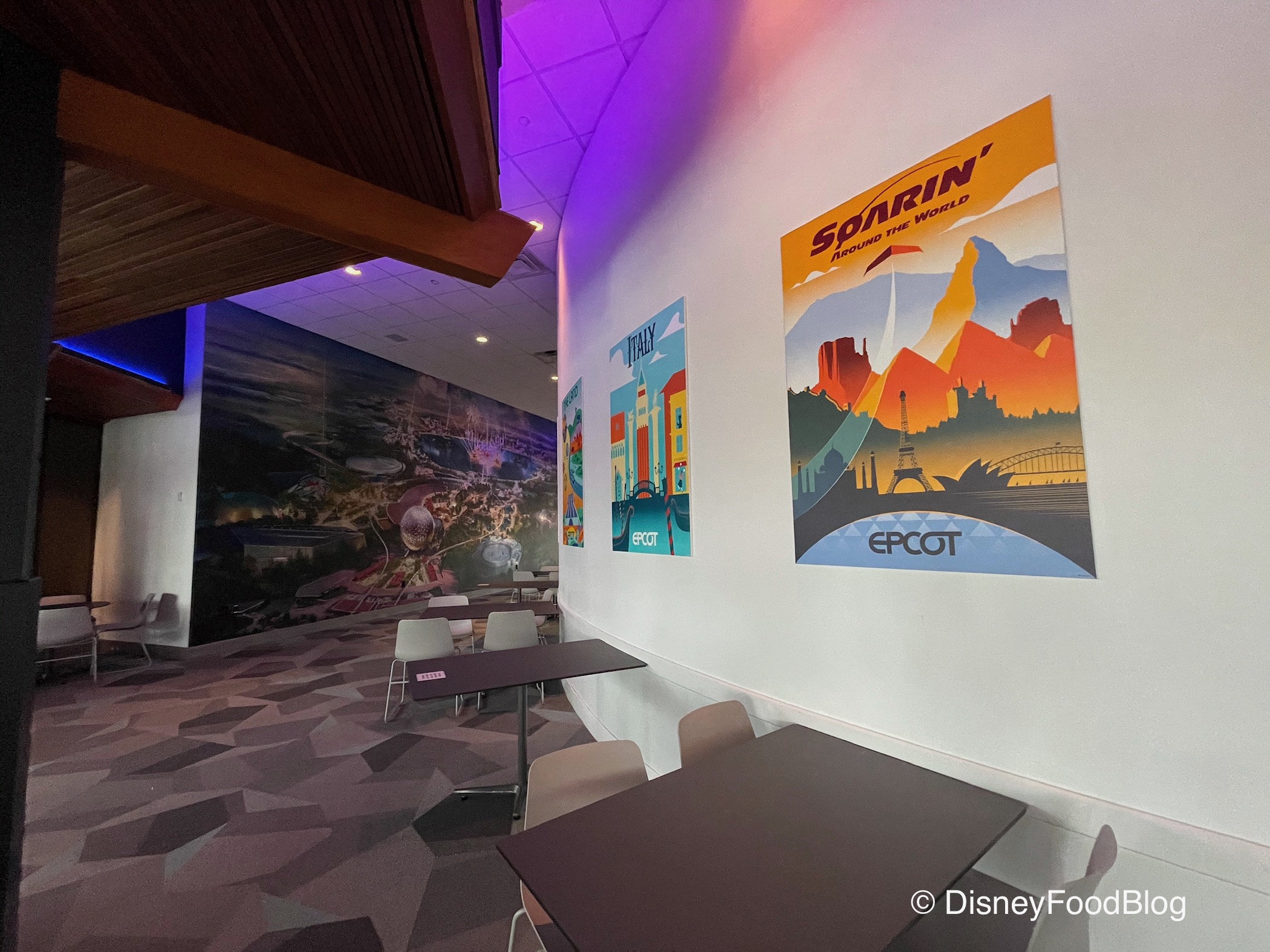 Not only is this a nice break from the sun, but there’s plenty of seats in this building, and lots to look at even while seated — the walls are covered in EPCOT concept art and vintage-style ride posters!