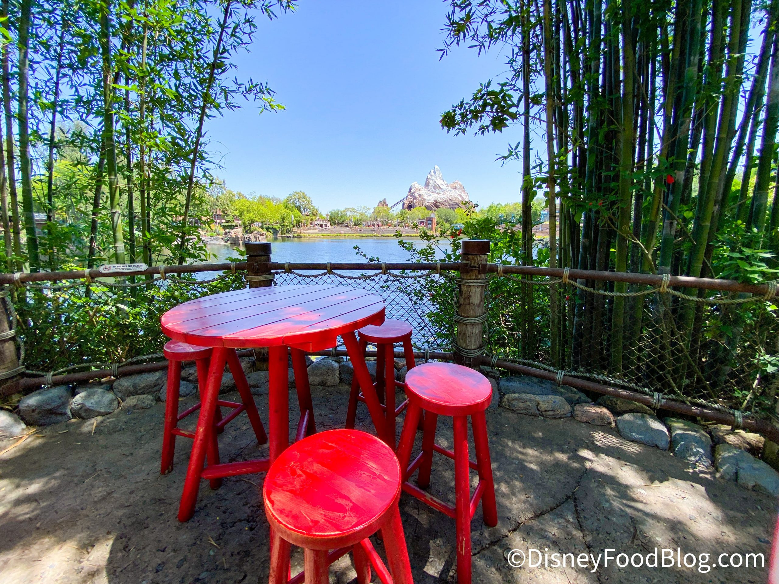 And, if you’d like some character views with your meal, you can also set up shop in this near-perfect spot and snack on your food from Flame Tree Barbecue while you say hi to the characters!