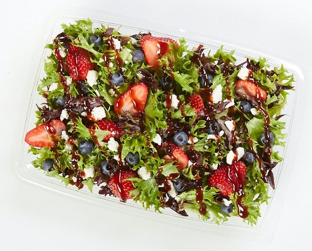 This salad features fresh seasonal berries, feta, and blackberry balsamic vinaigrette on a bed of mixed greens.