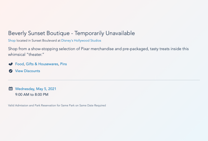 Disney World’s website now shows that Beverly Sunset Boutique will have operating hours of 9AM-8PM beginning on Wednesday, May 5th!
