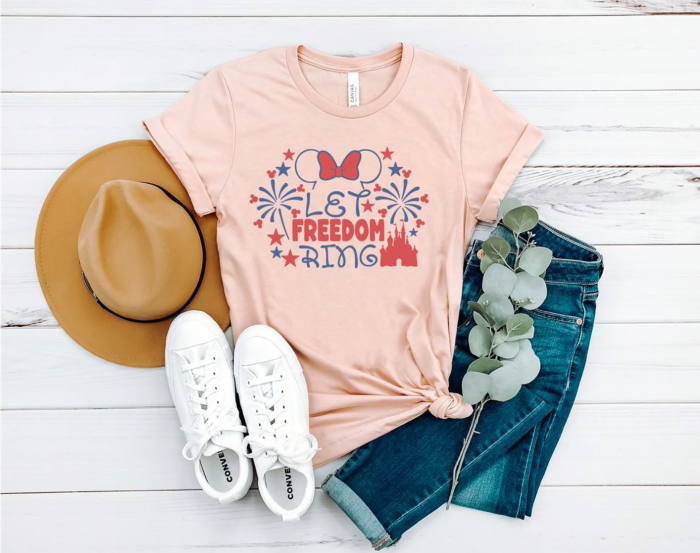 There are three tees to choose from and a range of colors for each. Colors include white, peach, cream, and ash gray. There’s a Mickey and Minnie version of “God Bless America,” and a third option featuring “Let Freedom Ring.”