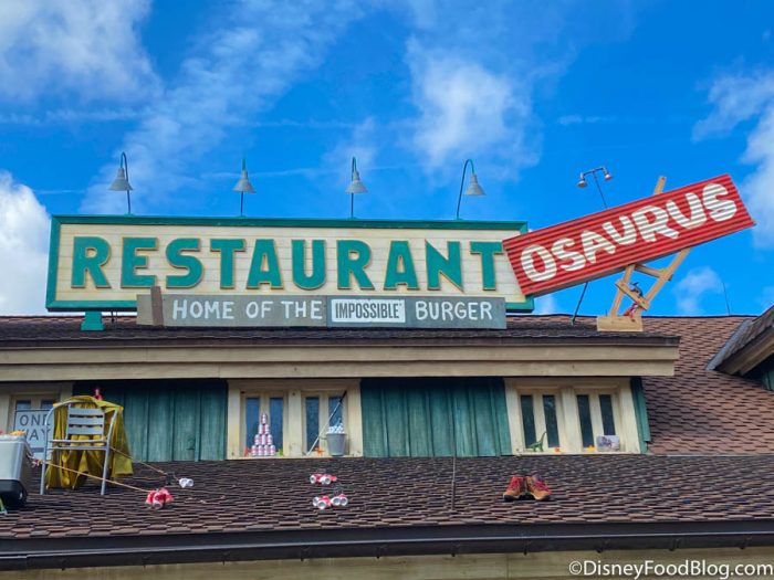 There new sign underneath the BIG sign reads “Home of the Impossible Burger!” Now, Restaurantosaurus does serve an Impossible Burger (the Impossible Spicy Southwestern Burger, to be exact!), and IMPOSSIBLE Foods has sponsored Disney World food spots before. We’re guessin’ that’s what’s going on here!