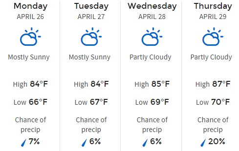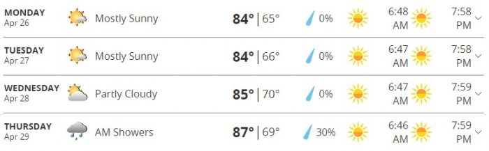 Monday, April 26th will start the week with the lowest temperatures — although that’s not saying much! That day is going to max out at an 84-degree high and we’ll see 65 degrees at night.