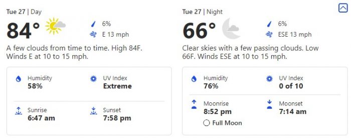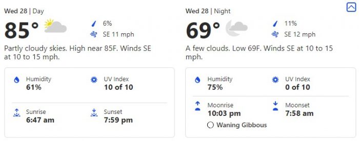 The next day, April 27th brings us a VERY similar forecast with another high of 84 degrees during the day and keeping that low down at a cool but still comfy 66 degrees.
