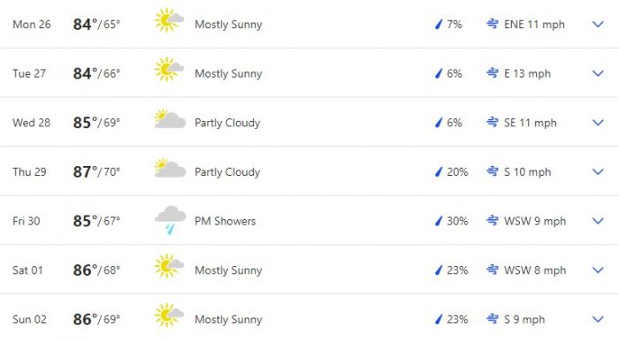 Here is a full overview of the week according to The Weather Channel. Temperatures are projected to hang out in about the same place for the whole week. We’re looking at a range of 80s highs and 60s to 70s lows.