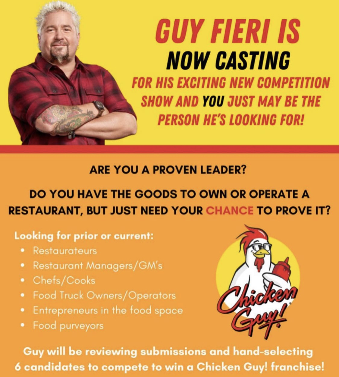 Yup, you read that right. Guy Fieri himself is casting a new competition show…and 6 lucky candidates will compete to WIN a Chicken Guy franchise! Fieri is looking for restauranteurs, restaurant managers, chefs, and more. Chicken Guy shared the full details on their Instagram story, which you can read below!
