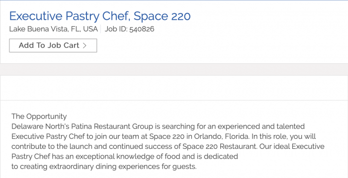 …and Space 220 also listed a job posting for an Executive Pastry Chef in February 2021.