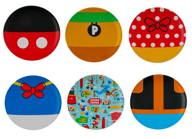 This set includes a Mickey plate, a Minnie plate, a Donald plate, a Goofy plate, a Pluto plate, and a design with all the pals!