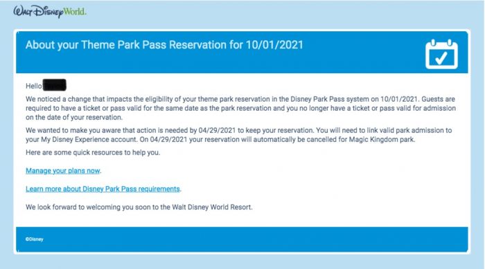 Disney has announced that in these cases, guests’ Park Pass reservations will be canceled. If you have a Park Pass reservation with no valid theme park admission for the same day, you’ll receive an email from Disney warning you about this impending cancellation. You’ll have a 48 hours to link valid park admission to your My Disney Experience account for that day before your Park Pass is canceled.