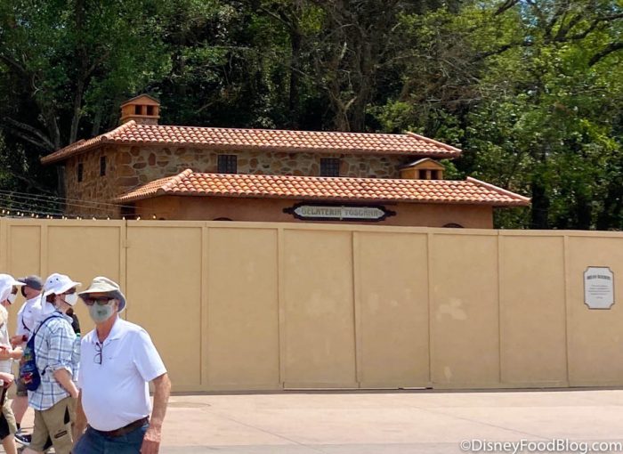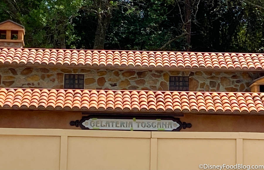 Disney also announced that Gelateria Toscana is opening in May (that’s next month, people) in EPCOT’s Italy Pavilion. We’ve been following the construction since the project was announced in 2019, and we are SO ready for an assortment of gelato, sorbetti, and tiramisù. And when we were walkin’ by the construction zone today, we noticed something HUGE!