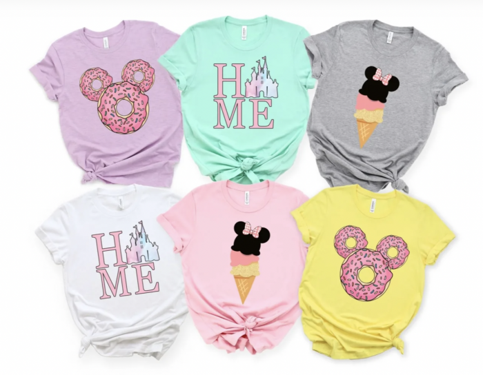 You know that here at DFB we love ourselves some giant donuts, ice cream, and Disney, and that’s exactly what the Magical Vacation T-Shirts Collection is all about! The tops feature three different styles, including a donut in the shape of Mickey Mouse, a 3-scoop ice-cream cone with Minnie ears, and “Home” with a castle as the “O.” And, you can even pick your color — the shirts come in lavender, mint, pink, white, and yellow.