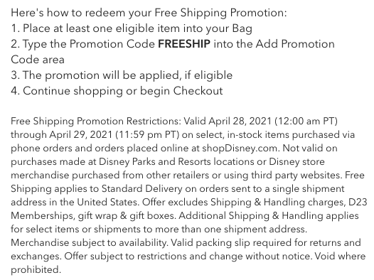 shopDisney’s free shipping deal was just extended another day! Your promo code FREESHIP is now valid through today, April 29th, at 11:59 PM PT. That’s another whole day is stock up on ears, backpacks, mugs…you get the point.