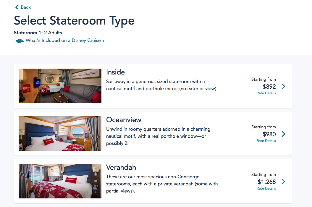 The cost of the cruise will depend on both the number of nights the cruise sails and which stateroom type you choose. The cheapest options are an Inside cabin and other options include Oceanview, Verandah, and Concierge.