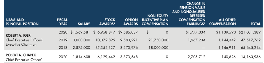 The chart also shows $1.78 million in “change in pension value and non qualified deferred compensation earnings.” All in all, Iger earned about $21 million for 2020.