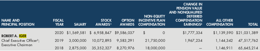 So, what happened in 2020? According to Disney’s proxy statement, Iger received the following in 2020: