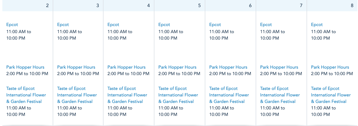 EPCOT will be open daily next week from 11AM-10PM. The Taste of EPCOT International Flower & Garden Festival will also be open daily next week from 11AM-10PM.