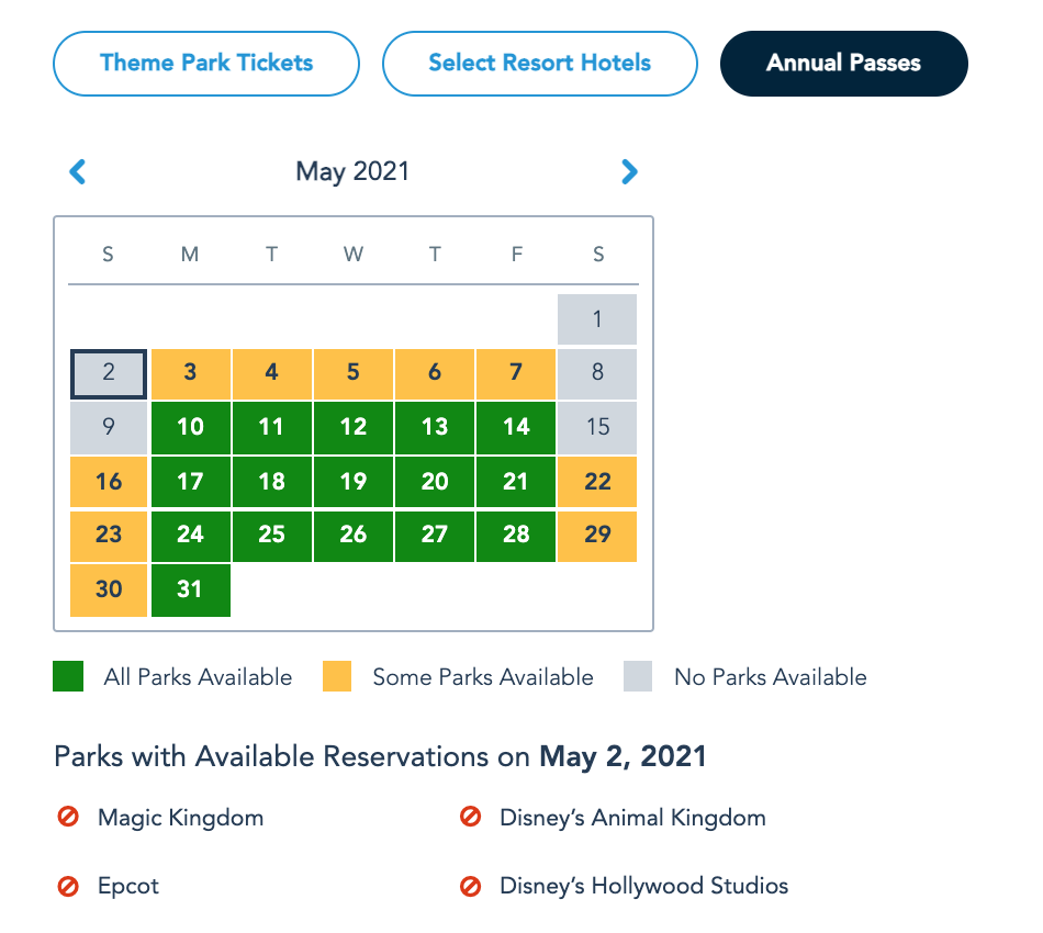 Current Disney Park Pass Reservation Availability the Week of May 2nd