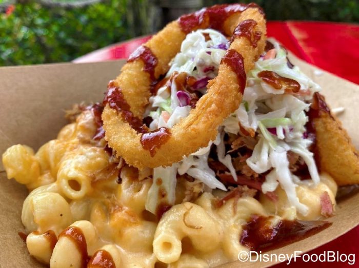 The Baked Macaroni and Cheese is piled high with pulled pork, cole slaw, a (very large) onion ring, and BBQ sauce.