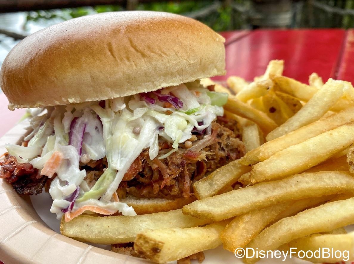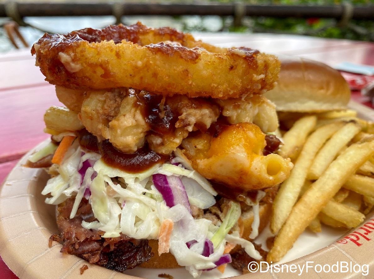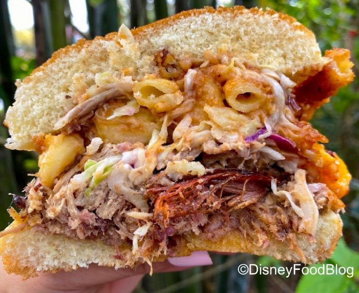 Flame Tree Barbecue remains a GREAT fast food option in Animal Kingdom! The portions are large and the outdoor dining area is beautiful and relaxing. You will NOT leave here hungry (especially if you order TWO entrees like we did!). We loved our Smoked Pulled Pork Mac and Cheese sandwich hack, but if you had to choose one or the other we’d recommend the mac and cheese. It had the best of everything and honestly, it’s what we gravitate towards every time we come here for good reason. If you’re looking for a solid choice for lunch on your Animal Kingdom day, you likely won’t be disappointed here. Keep checking DFB for more park snack hacks!