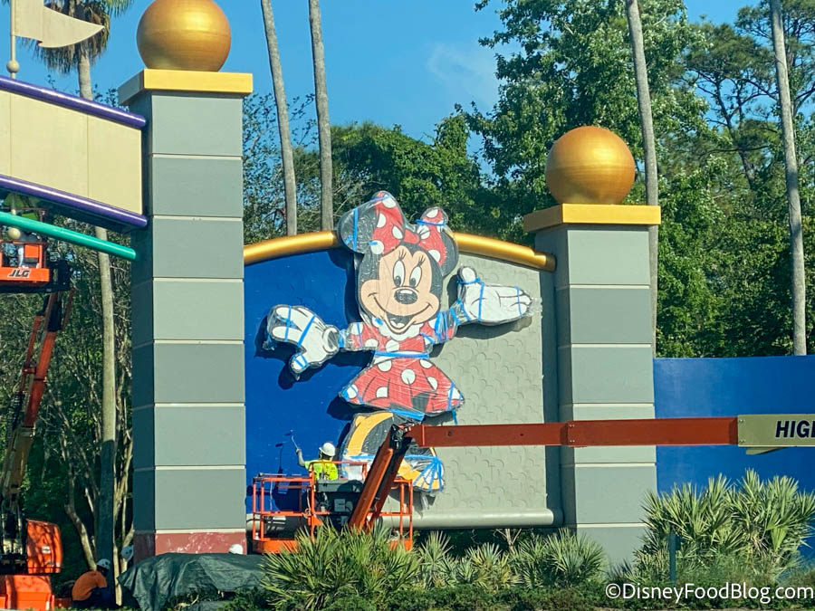 Minnie Mouse, here, is covered in plastic to prepare for the work being done on the sign.