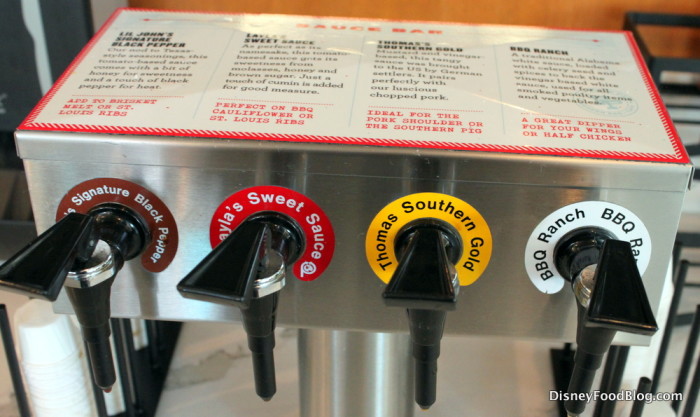 We’re headed into the top 5 picks now with Regal Eagle Smokehouse coming in with a HUGE variety of barbeque sauces! This BBQ joint is a newer addition to The American Adventure Pavilion at EPCOT and replaced Liberty Inn not too long ago. They serve up pork ribs, brisket, and smoked chicken and, while the meats are delicious, we come here for the 4 house-recipe sauces!