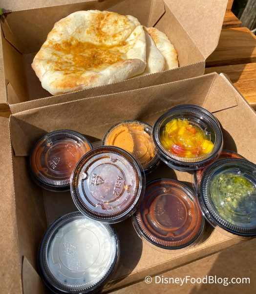 Coming in at the TOP of the list is Sanaa! Located in Animal Kingdom Lodge’s Kidani Village, this restaurant serves up a mix of African and Indian cuisine. But, the real star of the menu is hidden in the appetizers and labeled as simple Bread Service. It’s so so so much more than it sounds though! These sauces are so fancy that they even go by a more elegant name — accompaniments.