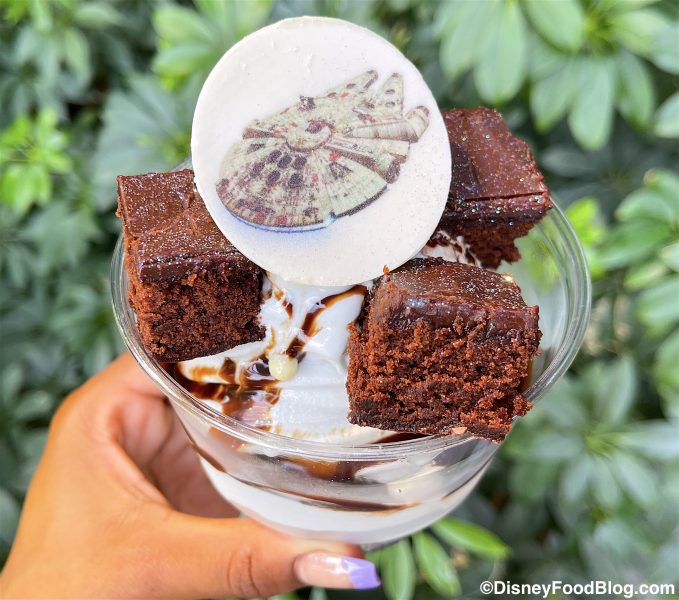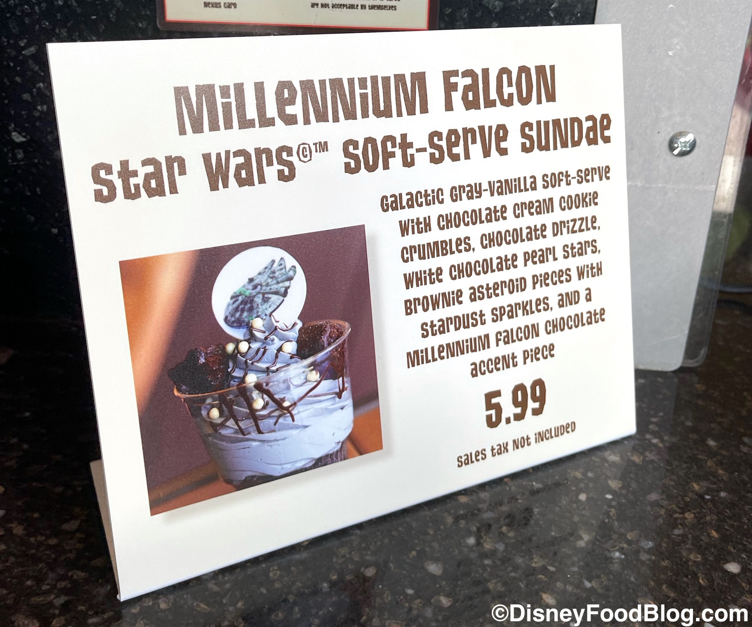 According to the sign, this treat is made with galactic gray vanilla soft-serve with chocolate cream cookie crumbles, chocolate drizzle, white chocolate pearl stars, brownie asteroid pieces with stardust sparkles, and a Millennium Falcon chocolate accent piece. That’s quite the sundae!