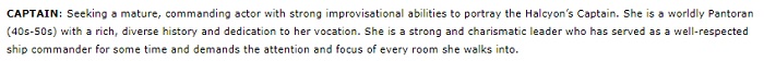 First up, we have The Captain, who will be a worldly Pantoran in her 40s or 50s. “She is a strong and charismatic leader who has served as a well-respected ship commander for some time and demands the attention and focus of every room she walks into,” the job description states.