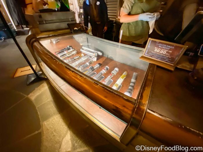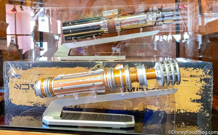 But, we did find it over at Disney’s Hollywood Studios. In the park, the lightsaber set is available at both the Stage 1 Company Store (today only) and Dok-Ondar’s Den of Antiquities. We found it specifically at the Stage 1 Company Store while it was open today.
