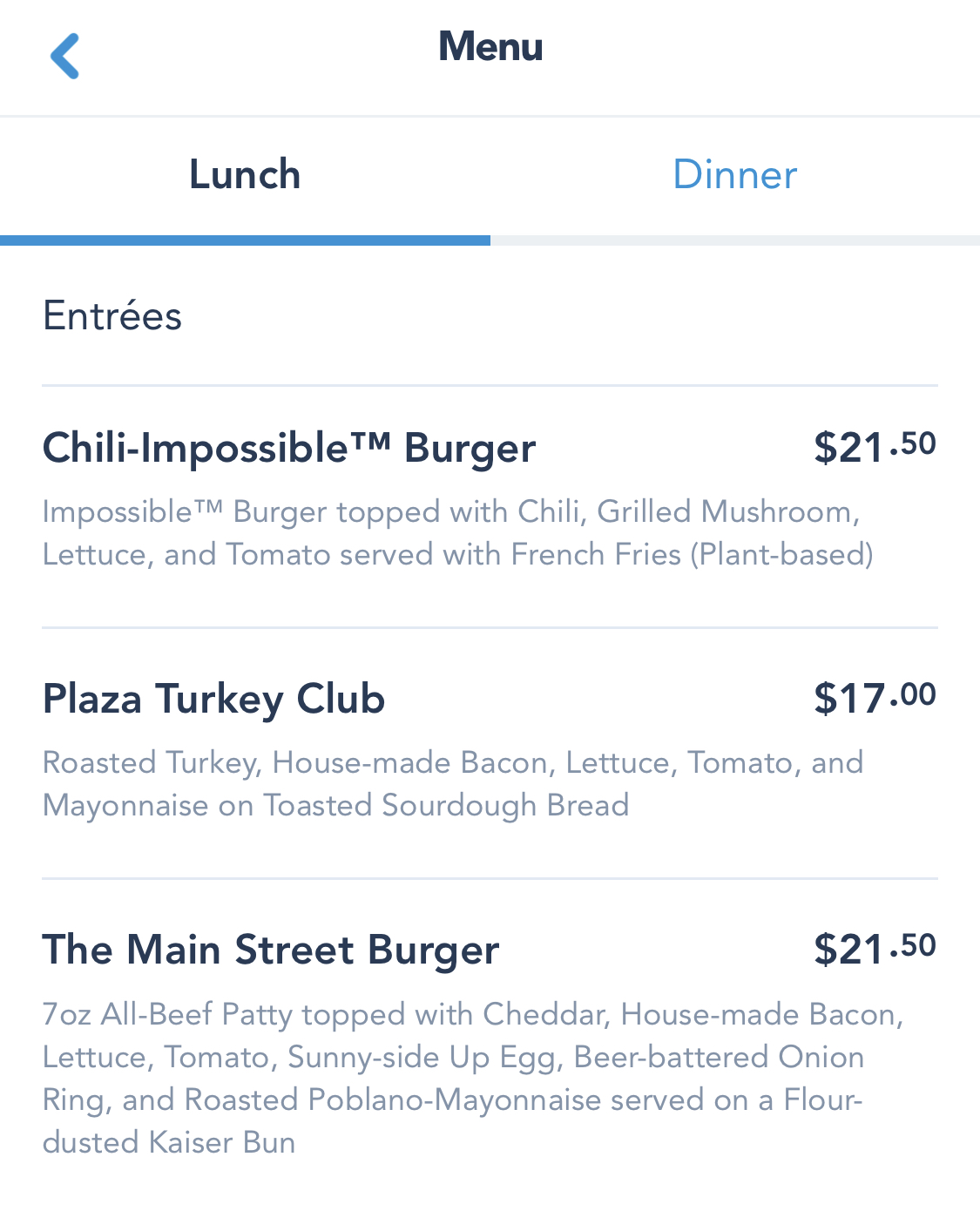 The Original Banana Split, Brownie Sundae, and The Plaza Restaurant Sundae are all listed on the My Disney Experience app…