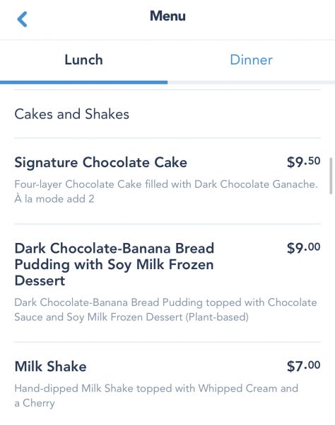 …as are the Signature Chocolate Cake, Dark Chocolate-Banana Bread Pudding with Soy Milk Frozen Dessert, and Milk Shake.