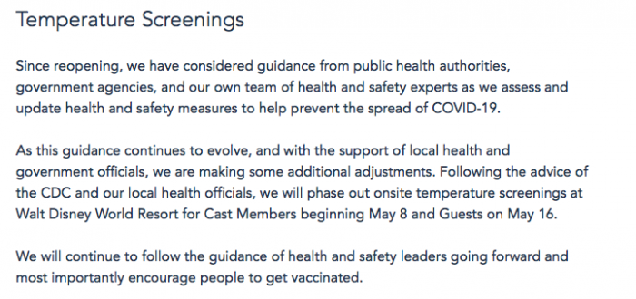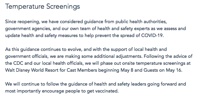 Disney World’s website now notes that they will be phasing “out onsite temperature screenings at Walt Disney World Resort for Cast Members beginning May 8 and Guests on May 16.”