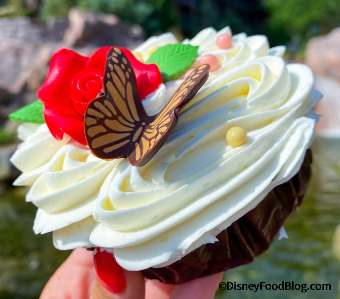 So today, we headed over to Roaring Fork at Disney’s Wilderness Lodge to try out the latest Mother’s Day creation, the Mother’s Day Cupcake. This is a Tres Leches Cupcake with vanilla buttercream and a milk chocolate butterfly.