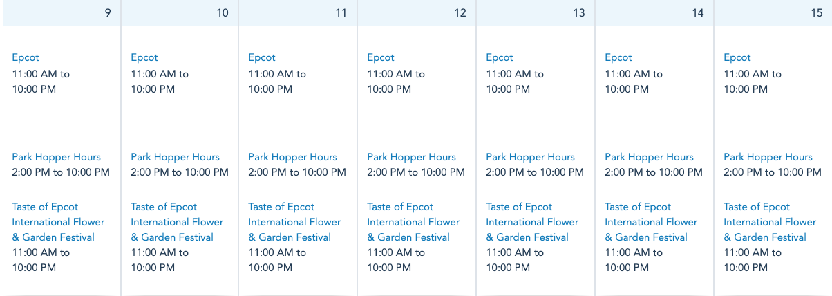 Over at EPCOT, the park will be open daily from 11AM-10PM. The Taste of EPCOT International Flower and Garden Festival will also be open from 11AM-10PM each day.