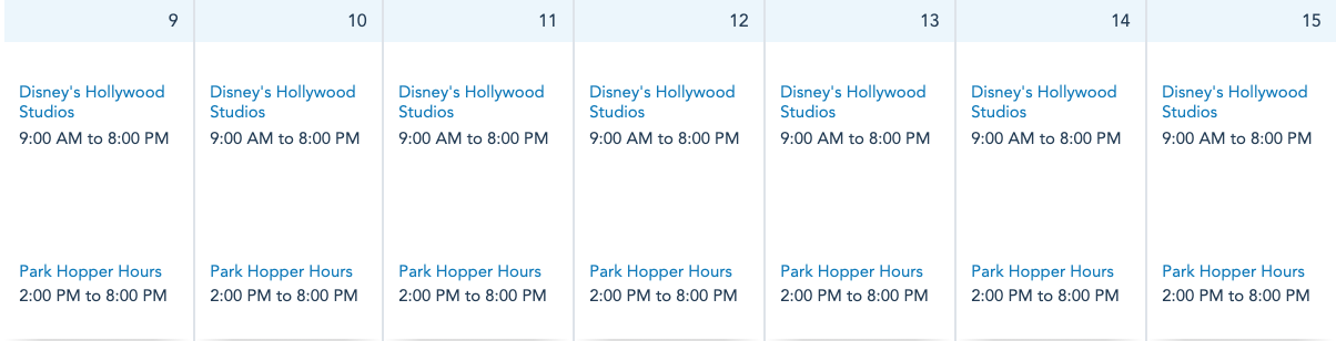 Let’s start with a look at the current park hours. Next week, Magic Kingdom will be open daily from 8AM-9PM.