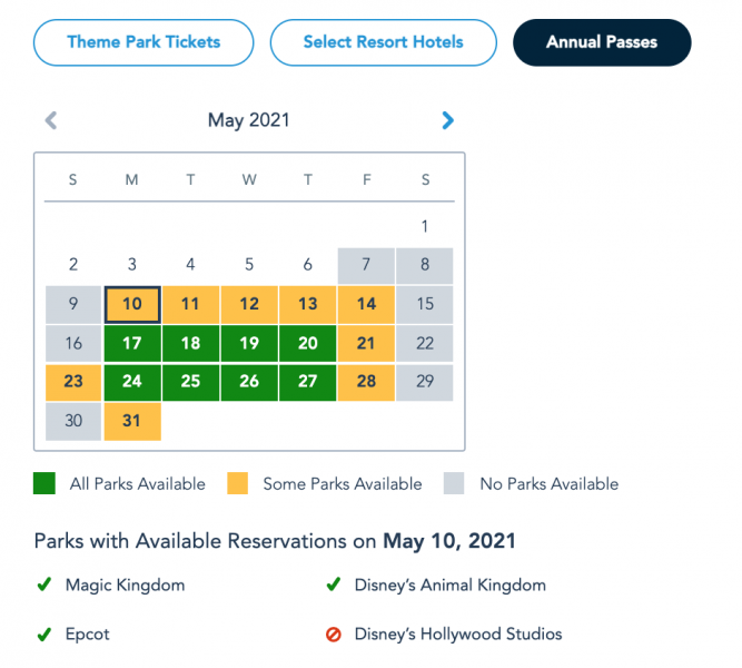 Finally, let’s review the current Park Pass Reservation availability for Annual Passholders. Like the other two ticket types, Annual Passholders cannot book a Park Pass Reservation at any of the four theme parks on Sunday, May 9th or Saturday, May 15th.