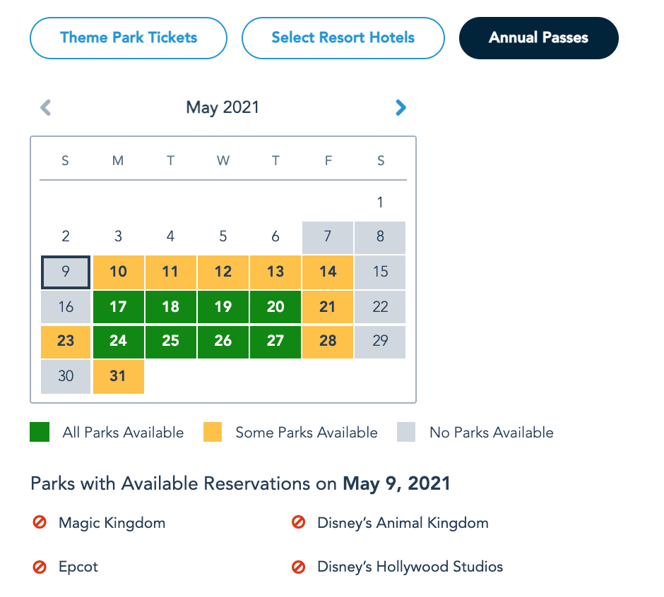 Park Pass Reservation availability for guests with Theme Park Tickets for May 9th as of May 6th © Disney