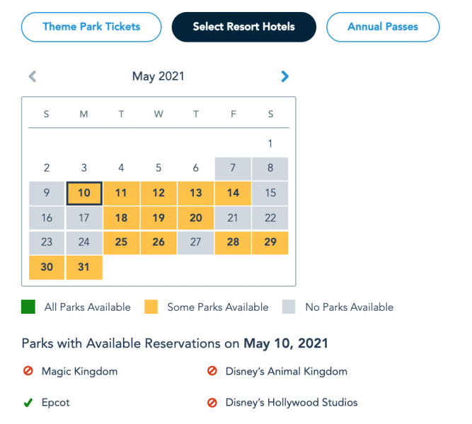 Park Pass Reservation availability for guests staying at Select Resort Hotels for May 10th as of May 7th © Disney