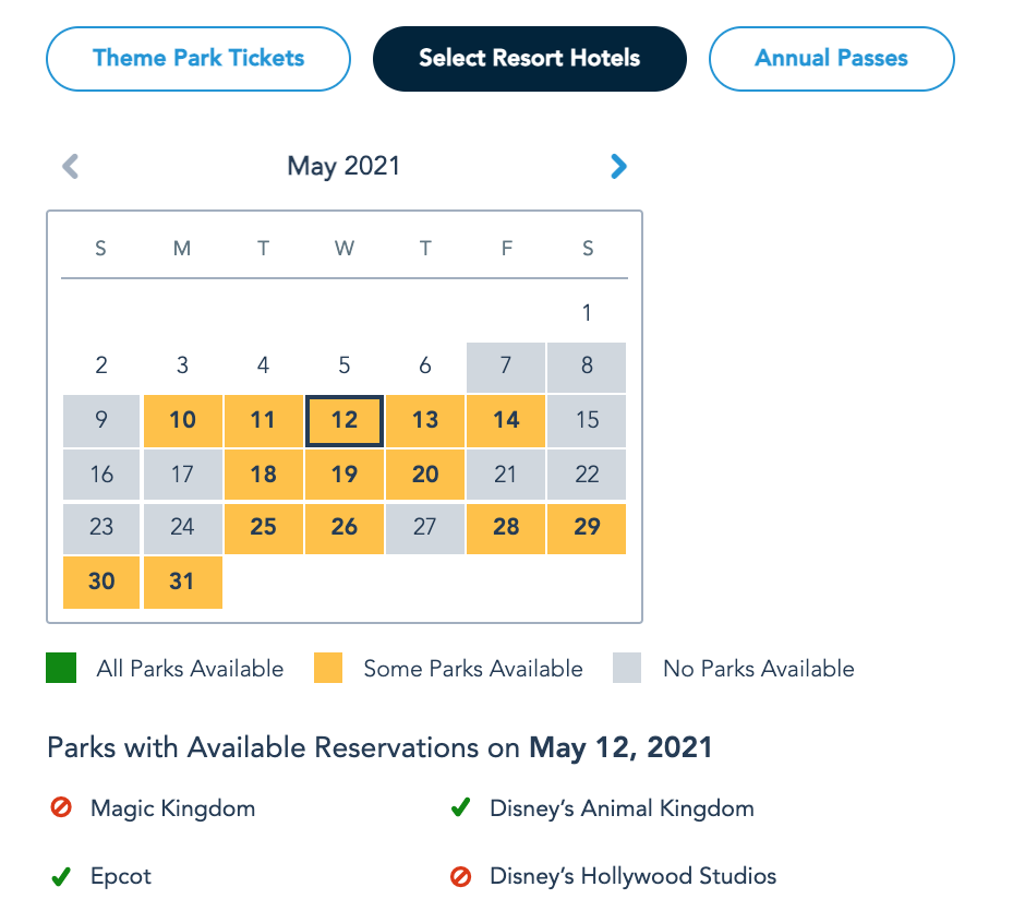 Park Pass Reservation availability for guests staying at Select Resort Hotels for May 12th as of May 7th © Disney