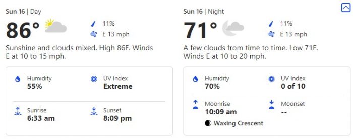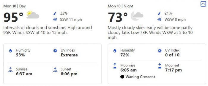 The next day, May 11th brings us a VERY similar forecast (shocker) with a high of 94 degrees during the day and keeping that low down at a comfy and warm 74 degrees.